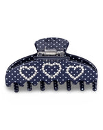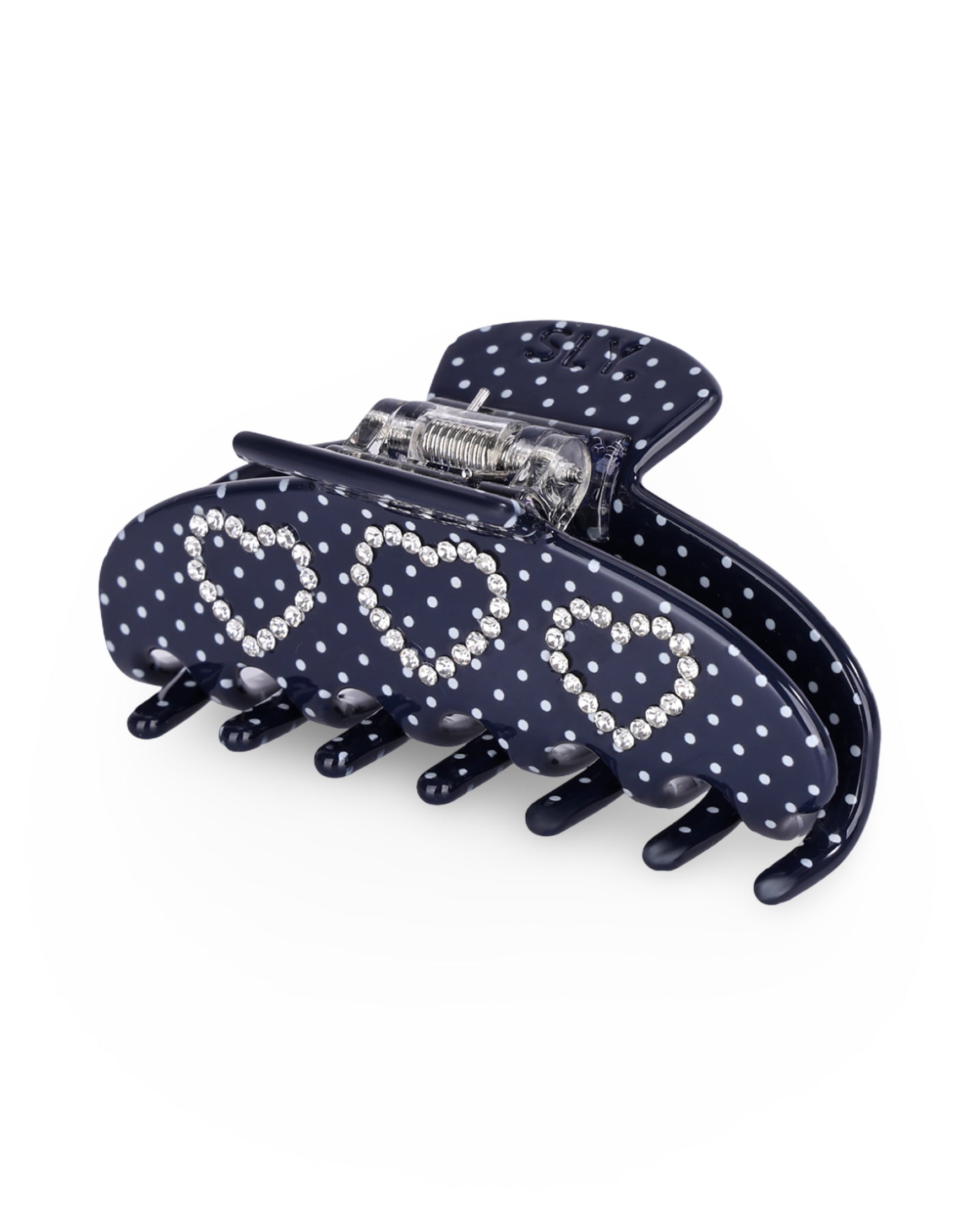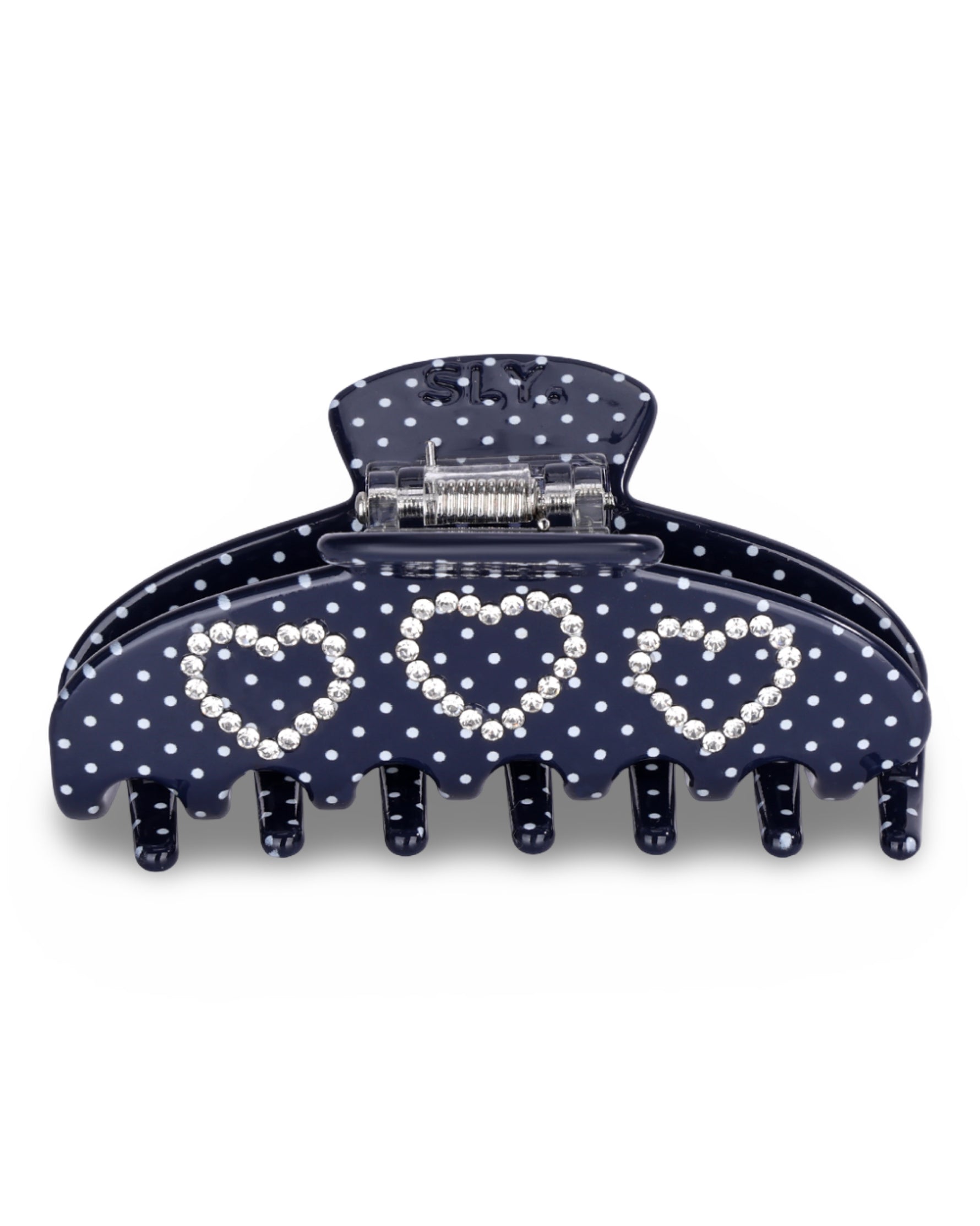 Bold, cute, and irresistibly stylish — the SLY Midnight Hearts Hair Clip is made for the girls who love a little sparkle with their everyday look. Designed in a deep navy color with white polka dots, this clip features three crystal-studded heart designs that shine beautifully from every angle.